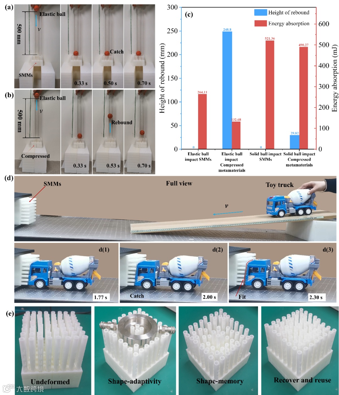 图5 多稳态力学超构材料的应用前景。(a)-(c)低速冲击试验下多稳态力学超构材料的能量吸收和防撞保护性能:(a)和(b)弹性球(橡胶)自由坠落试验(500 mm高度)。多稳态力学超构材料可以吸收弹性球的冲击能量并稳定接住弹性球。相比之下,从同一高度落下的弹性球在接触完全预压的多稳态力学超构材料时反向弹起一定的高度。(c)弹性球和实心球自由坠落试验的能量吸收情况。分别对比了弹性球和实心球冲击多稳态力学超构材料和完全预压的多稳态力学超构材料反向弹起高度和能量吸收(Ein)。(d)结构在低速行驶的玩具货车冲击时的阻尼性能。多稳态力学超构材料能够吸收玩具货车的冲击能量、适应车头形状且车没有反弹。(e)多稳态力学超构材料的可重复使用性:多稳态力学超构材料可以贴合非平面保护体且能恢复原来状态,重新使用。