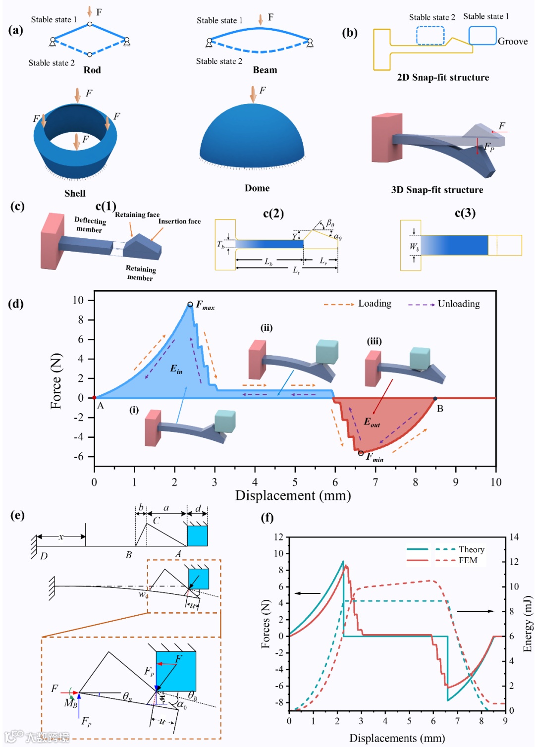 图2 双稳态卡扣结构的组成、尺寸标注,及悬臂梁卡扣在装配过程中的力学响应和机理分析。(a)-(b)典型的双稳态单元:(a)先前研究的双稳态单元:2D杆、2D梁、3D壳和3D圆顶。(b) 2D卡扣结构:卡扣和卡槽。3D卡扣在装配过程中承受水平装配力和向下偏转力。(c)悬臂梁卡扣的组成和尺寸标注。c(1)卡扣(锁定部分)由两部分组成:保持元件和偏斜元件。c(2)-(3)分别是悬臂梁卡扣的俯视图和正视图。(d)卡扣结构在装配时的力-位移曲线。曲线上显示出结构具有双稳态特性,A、B是两个稳定点。卡扣结构在装配时的状态:(i)插入面与卡槽接触,偏斜元件发生最大偏斜时的装配力最大(Fmax>0);(ii)保持元件在卡槽平面上滑动;(iii)保持面与卡槽接触,迅速达到最小装配力(Fmin<0)。蓝色曲线与x轴上方所围的面积为卡扣结构吸收能量(Ein)(蓝色面积);红色曲线与x轴下方所围的面积为卡扣结构恢复时释放的能量(Eout)(橙色面积)。橙色箭头和紫色箭头指示方向分别描述了卡扣结构加载和卸载过程。(e)卡扣结构在装配时的受力分析图(插入面与卡槽接触)。(f)理论和数值模拟得出的力-位移(实线)和能量(虚线)曲线。