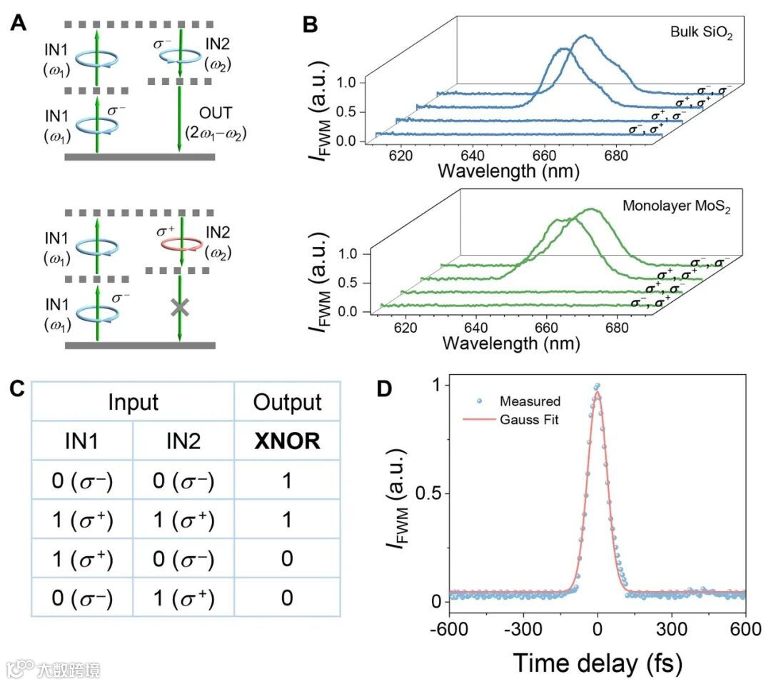 论文作者基于四波混频在对称性晶体中的手性选择定则,使用左、右旋手性光,在块体材料(玻璃)和单原子层材料(硫化钼)中得到了不同手性光组合激发下的四波混频信号(图1A&B所示)。据此特点,设计实现了超快的手性异或非门XNOR(图1C&D所示)。