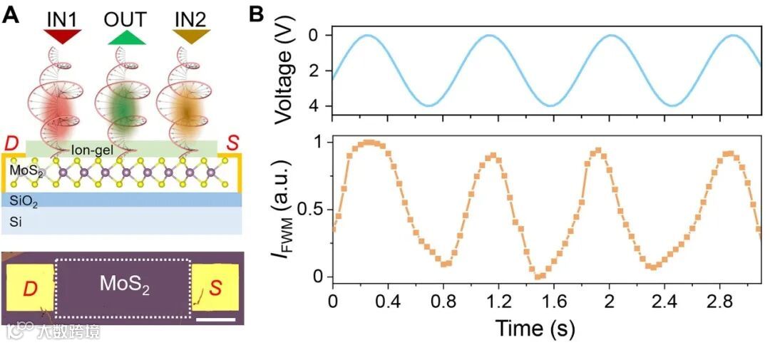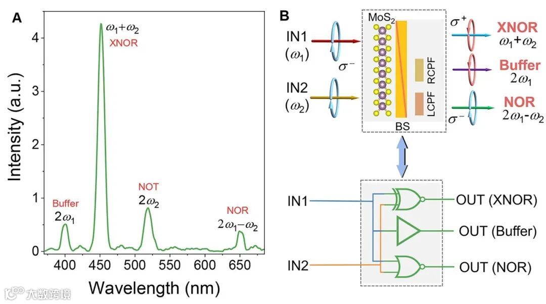 单原子层材料中,非线性过程的发生无相位匹配条件的限制。多个非线性过程,比如,二次谐波、和频和四波混频等可同时发生(图3A所示)。据此,实现了手性异或非门XNOR、手性缓冲门Buffer和手性或非门NOR在单个器件上的同时运行(图3B所示)。
