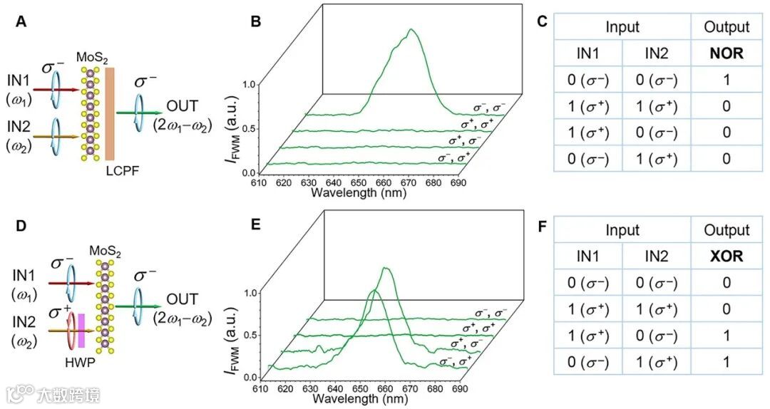 图2:手性逻辑门的多样性。A手性或非门示意图,B左旋光滤波片(LCPF)后单层硫化钼的四波混频光谱,C手性或非门NOR真值表,D手性异或门示意图,E单层硫化钼前插入半波片后的四波混频光谱,F手性异或门XOR真值表。