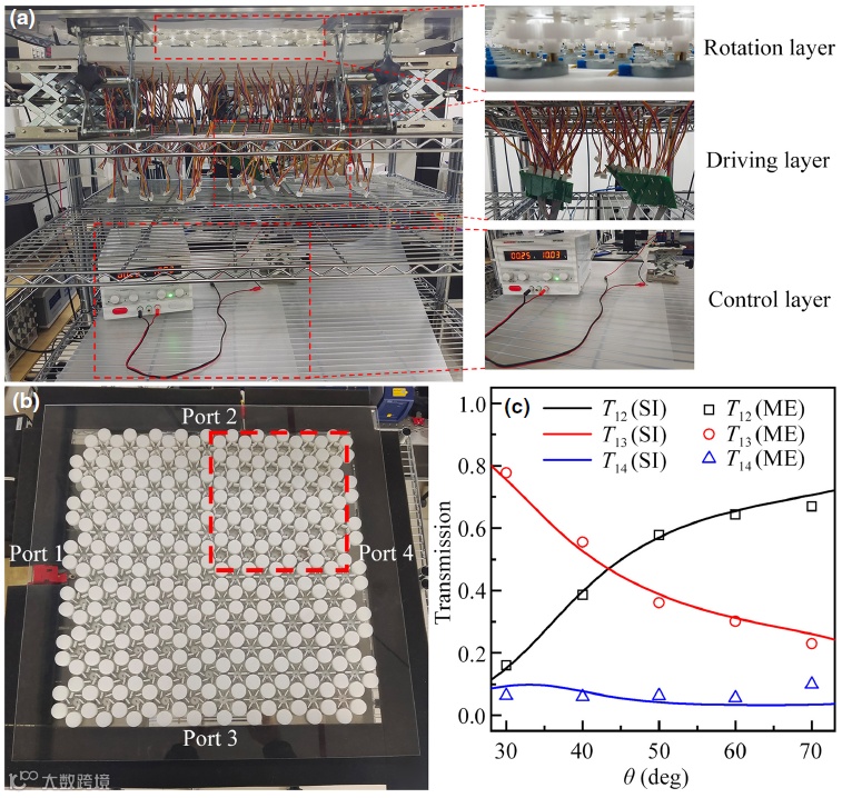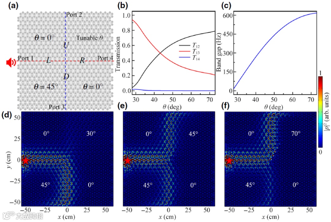 在此基础上,研究团队通过简单调制部分原胞中超材料的旋转角,实现了拓扑域的重新配置,从而可以非常方便地调节声波的传播方向(图2)。此外,研究团队通过调节右上区域的旋转角,调节了该区域原胞的带隙大小,显著地调控了声波能量分配比例(图3),并通过多层实验平台的设计和搭建,实验验证了声波能量分配比例随右上区域旋转角的变化(图4)。