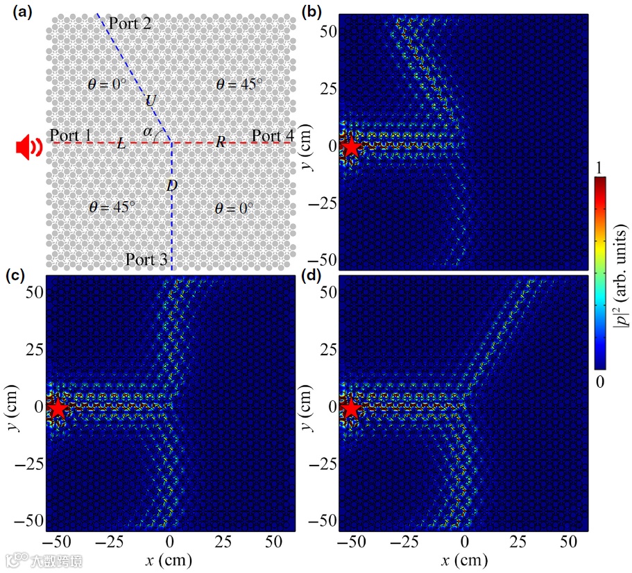 图2. (a) 拓扑多端口阀的示意图,用于在由四个域和四个端口组成的拓扑通道交叉点处划分界面态。频率为5.66 kHz时 (b) α = 60°,(c) α = 90°和(d) α = 120° 的声能量密度分布。