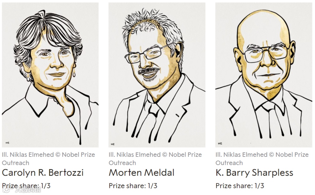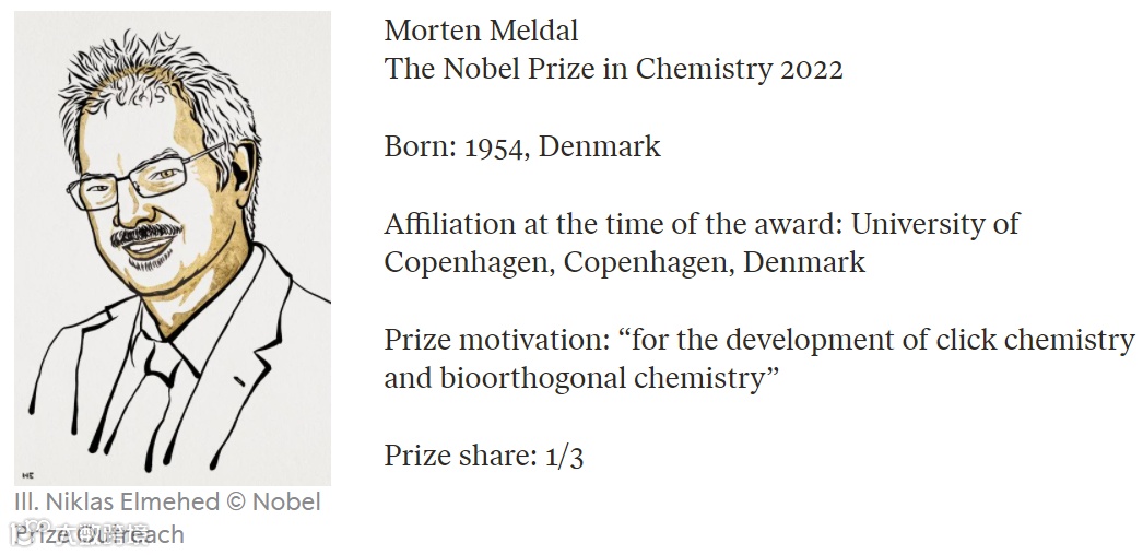 The Nobel Prize in Chemistry 2022 was awarded to Carolyn R. Bertozzi, Morten Meldal and K. Barry Sharpless "for the development of click chemistry and bioorthogonal chemistry"。