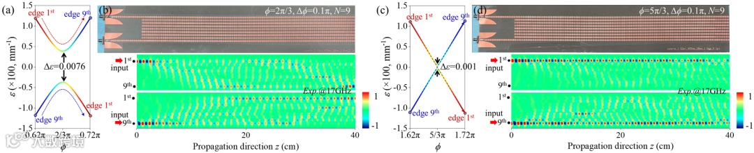 图3.微波波导阵列中拓扑泵浦和LZ跃迁的实验结果 (a)和(c)表示边界态二能级系统在ϕ=2π/3及ϕ=5π/3附近的本征谱。(b)和(d)表示在ϕ=2π/3及ϕ=5π/3的实验结果。