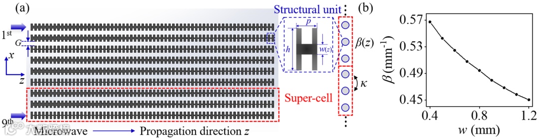图1.(a)基于AAH拓扑模型的微波波导阵列结构示意图。(b)传播常数随结构参数w(z)变化曲线。