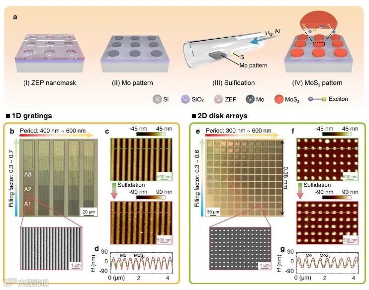 另一方面,化学沉积作为一种成熟的自下而上的(bottom-up)方法,被广泛应用在二维材料的大规模制备上。这似乎给上诉困局打开了思路。香港中文大学许建斌老师团队和苏州大学陈泽锋以及王绍军老师团队合作,探索基于化学沉积方法制备大规模超构表面的方法(图1)。团队首先利用电子束光刻制备金属钼(Mo)的超构表面,然后在保护气体的氛围下进行高温(750 ℃)硫化,来制得大规模的MoS2超表面。该方法流程简单,可重复性强。相比于前人的方法(基于机械剥离),该方法实现了对超构表面厚度以及整体器件大小的可控,为基于TMDC超构表面的设计和制备开拓了崭新的道路。