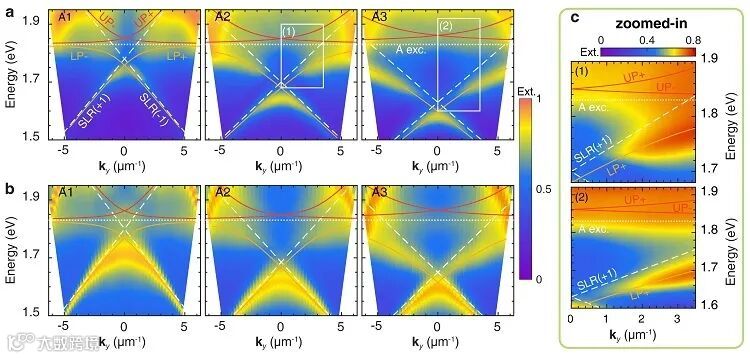 同时,团队还对制得的超构表面进行了光学表征(图2)。团队不仅通过角分辨消光谱观察到表面晶格共振(surface lattice resonance)模式的色散,而且发现该光学模式和MoS2自身的激子(exciton)发生了强耦合,形成了具有“半物质-半光子”的准粒子——激子极化激元,为研究物质与光相互作为拓展了思路。即,通过TMDC这种本身具有激子响应的材料来构造光子结构,可以在同一个体系里实现光子模式和激子的耦合,而不需要借助额外的手段使两者结合。
