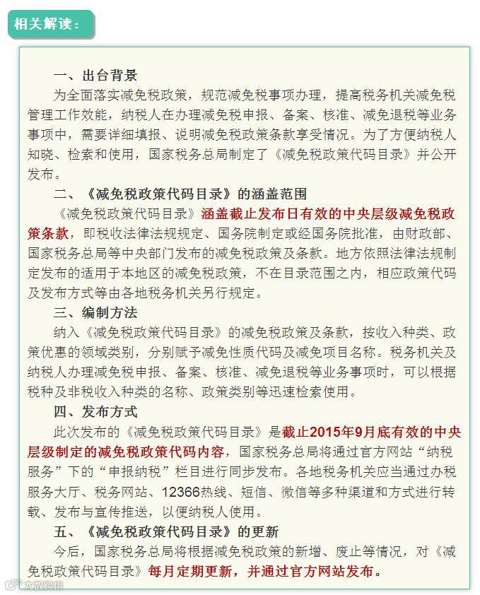 为全面落实减免税政策,规范减免税事项办理,提高税务机关减免税管理工作效能,国家税务总局制定了《减免税政策代码目录》,现予以发布,并将有关问题公告如下: