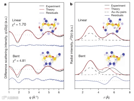 使用Au–Au距离作为拟合参数,对每种状态下与物种相关的RDF进行了结构拟合分析,以重建四种状态的结构并提取每种状态的Au–Au距离。结果表明,四种状态的重构结构与从图2b推断出的结构变化非常一致,Au–Au距离的变化以及S0、S1、T1和四聚体态的构象与之前的理论计算结果非常一致。瞬态吸收研究中发现的过渡时间尺度与本工作的结果很匹配,但具体的结构变化分配不同。特别是,从TRXSS测量中,推断弯曲到线性转变发生在几百飞秒内,而不是在2 ps的时间尺度上。为了解释这种差异,使用两种不同的模型结构,通过拟合200 fs时间延迟下的实验差分散射曲线,更仔细地确定了S1状态的结构(图3),结果表明由线性结构计算得到的理论散射曲线在200 fs时间延迟下与实验散射曲线的吻合程度远远优于由弯曲结构计算得到的理论散射曲线,证实了弯曲到线性过渡必须在200 fs的延时下完成。