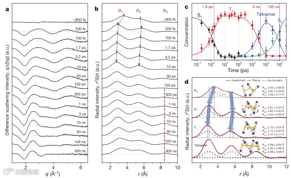 作者使用浓度为300 mM的Au(CN)2水溶液,TRXSS实验中使用的267nm激光激发主要激发[Au(CN)2–]3三聚体。从TRXSS实验中,获得了差分散射曲线(图2a)。曲线显示出沿q轴的明显振荡特征,这表明[Au(CN)2–]3在共价Au–Au键形成期间发生了较大的结构变化。即使在最短的时间延迟(200 fs)之后,振荡特征也是明显的,[Au(CN)2-]3中成键的第一步必须在时间分辨率(~500 fs)内脉冲发生。通过傅里叶转换得到实空间中的差分径向分布函数,获得了更直观的结构变化图像(图2b)。图2b中的2个峰分别归属于Au1-Au2(p1)和Au2-Au3(p2),结果表明,在S0态下,Au原子是弱结合的,具有弯曲结构。200 fs下与-800 fs时的RDF显著不同,表明[Au(CN)2–]3中键形成的第一步发生在实验时间分辨率内。与S0态相比,在200 fs的延时下,R13略有增加,R12和R23显著降低,表明在这一步形成了共价Au–Au键,从发生了从弯曲几何结构到线性几何结构的构象转变。通过奇异值分解(SVD)和主成分分析,获得了四种状态的物种关联RDF,即基态(S0)、激发态(S1)、三重态(T1)和四聚体(图2d),以及它们的动力学。通过物种相关RDF的线性组合拟合了不同时间延迟下的实验RDF,并根据相应物种相关RDF的系数确定了每种状态的时间依赖性浓度