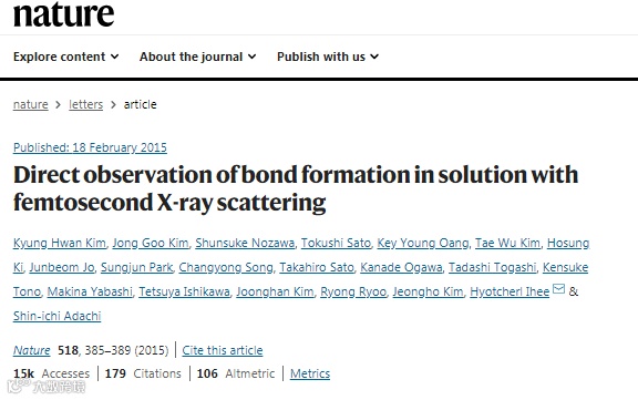 Kim, K., Kim, J., Nozawa, S. et al. Direct observation of bond formation in solution with femtosecond X-ray scattering. Nature 518, 385-389 (2015).