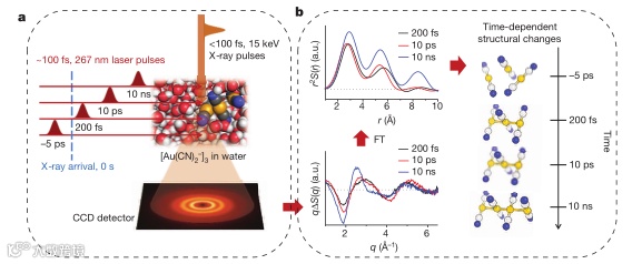 总之,通过确定[Au(CN)2–]3复合体中共价Au–Au键形成的整体机制和获得丰富的结构信息,证明了基于XFEL的飞秒TRXSS的能力。飞秒TRXSS提供了一种实时和实时可视化光诱导反应整个过程的方法,可以作为研究化学和生物系统反应动力学的基本工具。