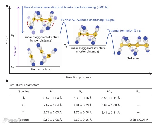 有鉴于此,韩国纳米材料与化学反应中心Kyung Hwan Kim等人使用飞秒时间分辨X射线溶液散射(TEXSS)来实时观察金三聚物[Au(CN)2–]3的形成,而不受缓慢扩散的限制。这种光激发的金三聚体具有基态的弱结合金原子,经历了一系列结构变化,作者探索了各个反应步骤的动力学,包括共价键形成、bento线性转变、键收缩和四聚体形成,时间分辨率为500飞秒。还测定了反应中间体的三维结构,空间分辨率为亚埃。这项工作表明,使用X射线自由电子激光器和时间分辨溶液散射数据的高级分析,可以详细实时地跟踪溶液中化学反应期间发生的结构变化。