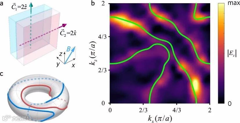 实验上,研究者研究了m=2,n=2的情况。实验装置和结果如图7所示。可以看出,在两个三维陈绝缘体交界面的布里渊区上,有两个独立的费米环相互嵌套在一起形成了一个纽结理论中最简单的链环——Hopf link。