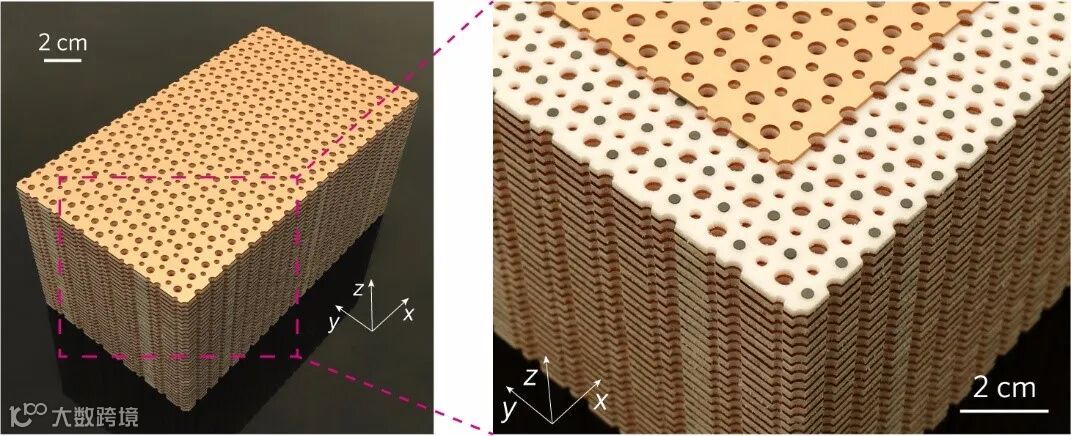 三维磁性光子晶体可以通过堆叠二维磁性光子晶体并引入层间耦合得到。实验样品如图2所示。实验中,将整个样品置于z方向的均匀磁场中以打破时间反演对称性。当我们调节外加磁场的强度,三维磁性光子晶体就会依次表现出三种不同的拓扑态:拓扑平庸态、理想外尔半金属态和三维陈绝缘体态。