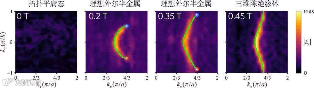 其中拓扑平庸态可理解为传统意义上没有拓扑性质的普通绝缘体。然而,理想外尔半金属的出现却是一个惊喜。在第一布里渊区中,理想外尔半金属的两个能带之间通过有且只有一对外尔点相连接,它是理论上最理想、最简单的一种外尔半金属。值得一提的是,理想外尔半金属在其他体系中的实现也极为困难。直到2021年,中国科技大学潘建伟院士研究团队才首次在冷原子体系中观测到这种单对的理想外尔点。然而,由于实验体系限制,他们并没有观测到理想外尔半金属的另一个重要特征——单条费米弧表面态。