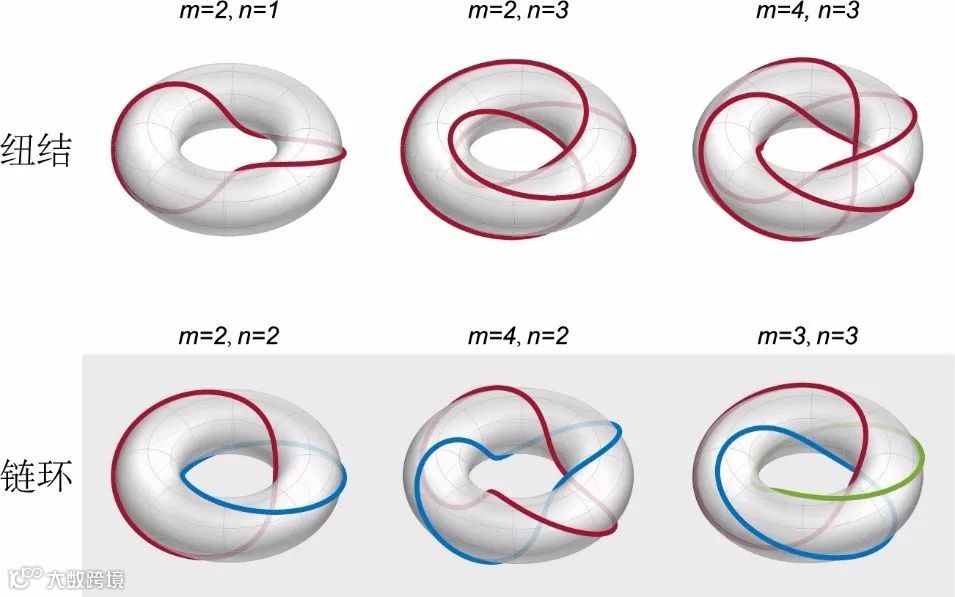 对于图5中的两个三维陈绝缘体,陈矢量的大小分别为m和n,但是陈矢量的方向相互正交。在它们的交界面,费米环表面态在表面布里渊区的形状与m和n的取值有关。巧合的是,拓扑学里有个名叫纽结理论(knot theory)的数学分支便是专门研究这种结构的。根据数学上的结论,我们可以得知,如果m和n互质,则费米环表面态会形成独立纽结。相反,如果m和n不互质,则会形成多个纽结嵌套在一起的链环,且纽结个数为m和n的最大公约数。图6展示了对于不同陈矢量的组合,费米环表面态在表面布里渊区的投影。由于纽结和链环的形成是由陈矢量决定的,因此它们的结构也是受到拓扑保护的,能够极其稳定的存在,未来可能用于拓扑计算等领域。