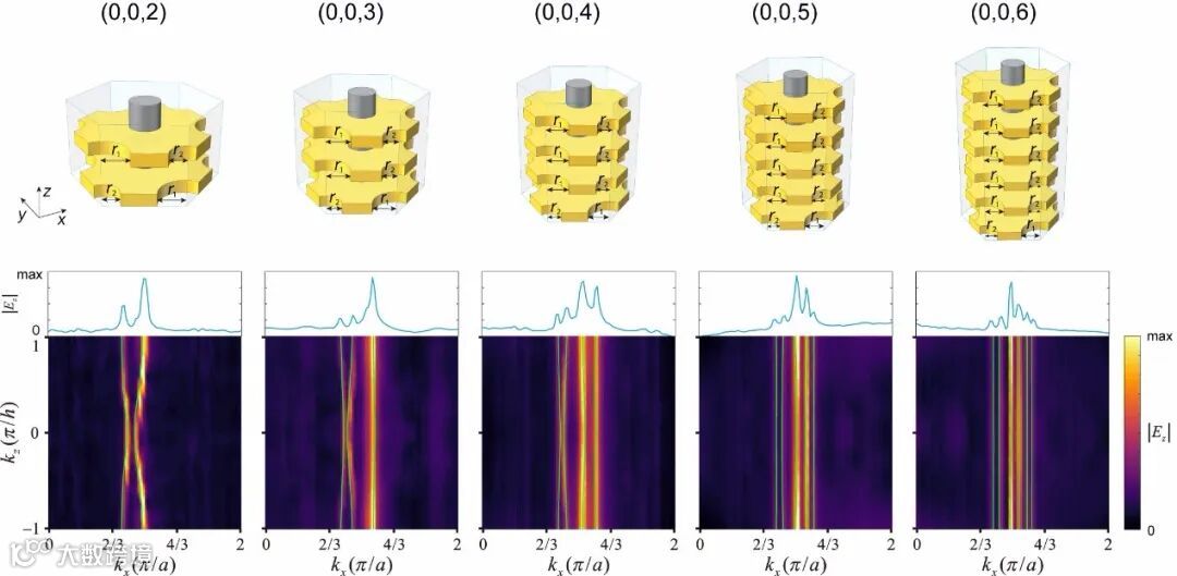 对于二维陈绝缘体,一个陈数便足以描述其能带的拓扑性质。然而,对于三维陈绝缘体,需要用由三个陈数构成的陈矢量来描述。陈矢量具有大小和方向两个特征。实验中,研究者通过调节光子晶体的层间耦合,构造超晶胞,来实现对陈矢量大小的调控。不同陈矢量对应的超晶胞和费米环表面态如图4所示。理论上,通过这种方法,可以获得数值上任意大的陈矢量。