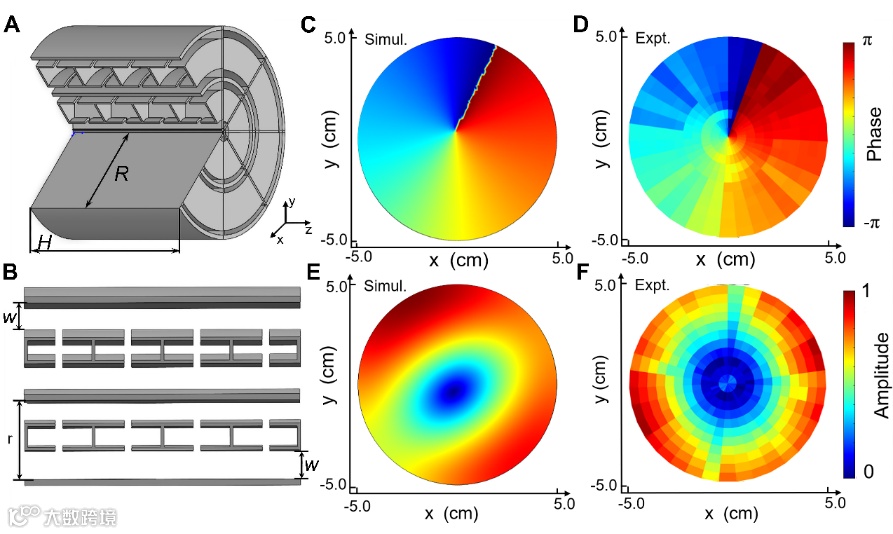 图2 (A) 8个扇形双开口谐振腔组成的涡旋发生器结构示意图。(B)径向方向上,单个结构由两层双开口谐振腔组成。(C) z = λ处的数值模拟相位分布图。(D) z = λ处的实验测量相位分布图。(E) z = λ处的数值模拟声场分布图。(F) z = λ实验测量的声场分布(空气中λ= 17cm)。
