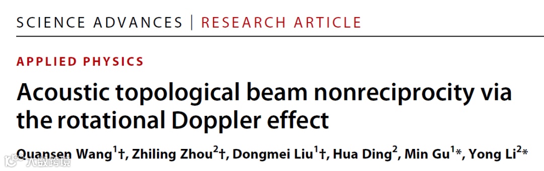 近期,华南师范大学顾敏副教授课题组和同济大学李勇教授课题组合作,通过将旋转多普勒效应与无源超表面结合,实现了基于拓扑束演化的非互易声隔离。利用多普勒效应的转动自由度,将非互易的研究对象从平面波扩展到具有拓扑束的声束中,并且隔离和传播分别受正、负旋转方向和速度控制。受益于机械旋转,本工作实现了拓扑束在传播和隔离之间快速且灵活的演变。相关研究成果近日以“Acoustic topological beam nonreciprocity via the rotational Doppler effect”为题发表于Science Advances (Sci. Adv. 8, eabq4451 (2022))。华南师范大学硕士生王泉森、同济大学博士生周志凌、华南师范大学刘冬梅副教授为该工作的共同第一作者,同济大学博士生丁华参与了部分工作,顾敏副教授和李勇教授为论文的共同通讯作者。