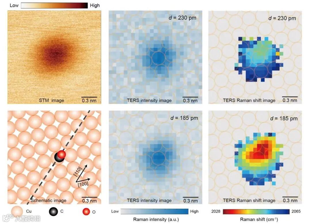 为了进一步验证CO分子在表面的倾斜情况,研究人员在不同针尖高度下对CO分子进行了埃级分辨的TERS成像。