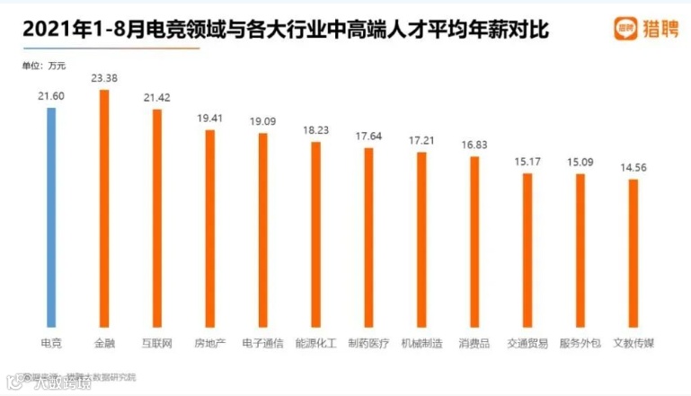 猎聘大数据研究院在《2021电竞领域中高端人才就业大数据报告》中就显示,电竞高端人才薪资仅次于金融行业。薪资是平均工资的3倍。