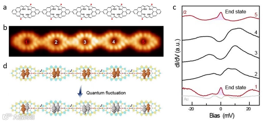 在该工作中,研究人员进一步在无金属的卟啉体系中,精准构筑了一维量子自旋链。通过超高分辨的扫描隧穿微分谱技术,确定性证实了其存在末端分数激发效应,和Haldane理论预测相符合(图1)。