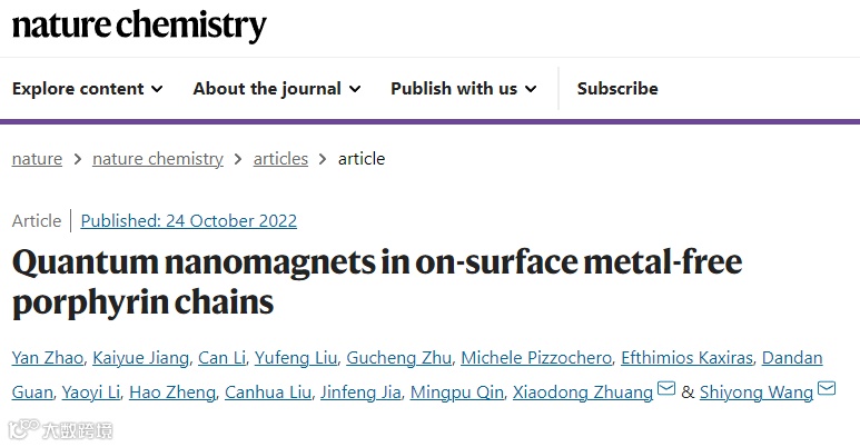 10月24日,《自然化学》以“Quantum nanomagnets in on-surface metal-free porphyrin chains”为题发表了上海交通大学物理与天文学院王世勇和化学化工学院张江高等研究院合成中心庄小东教授合作的最新成果。该研究通过表面化学合成方法,在无金属卟啉分子链中,成功的构建了一系列的分子量子磁体,并观测到了集体的量子激发态和分数化末端态。
