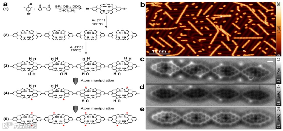 ▲图2 分子量子磁体的合成路径,扫描隧道显微镜展示的量子磁体制备情况,非接触原子力显微镜展示的量子自旋链构造情况。