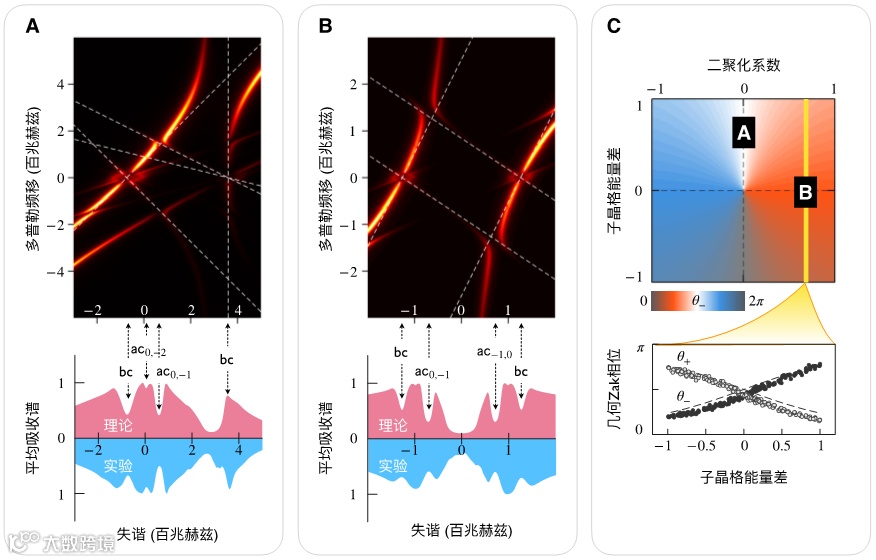 该研究团队调节两束激光耦合原子实现了多种两能带超辐射晶格结构,并通过分析其吸收谱得到了能带的几何相位。他们发现,原子的速度决定了动量空间等效电场的大小以及原子的瓦尼尔-斯塔克能梯间距。对于某些速度,两个能带的能梯会发生反交叉,从而在吸收谱上造成凹陷。研究团队通过标定凹陷的位置,计算了能梯随速度变化的斜率,从而获得了能带的几何相位。他们测量了Semenoff绝缘体(图3A)、Su-Schrieffer-Heeger模型(图3B)和更一般的Rice-Mele模型(图3C)的几何相位。实验结果直接证明了该方法的有效性。