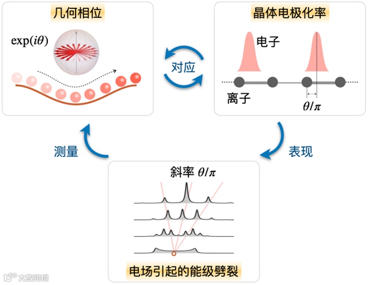 图1 电子波包经过布里渊区之后获得几何相位,其大小与晶体电极化率直接对应。在电场下的瓦尼尔-斯塔克能级劈裂反应出几何相位信息。