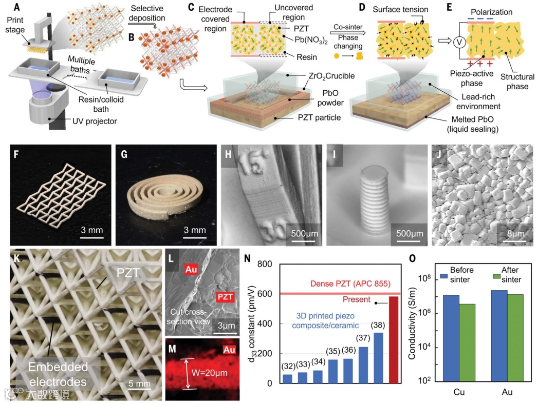 1)使用一种具有空间编程静电荷的多材料立体光刻系统,并在选定区域制造了装饰有导电金属和压电特性的 3D 陶瓷晶格。