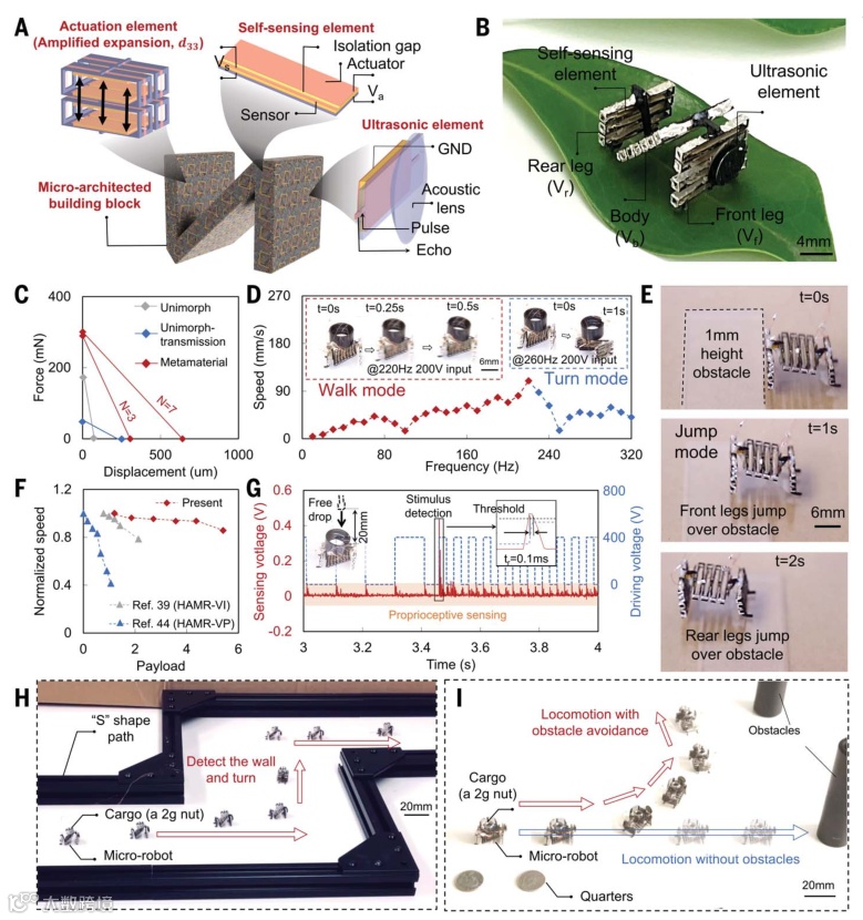 由此产生的结构是一种使用电场到机械应变的双向转换来产生运动和传感机器人超材料。逆压电效应赋予机器人驱动能力,而直接和双向压电效应分别通过本体感受(自我监测)和外部感受(接触检测和遥感)实现反馈控制。超材料的拓扑结构允许将电极直接放置在压电活性支柱上,从而诱导更强的电场并放大驱动应变。用压电超材料制造的概念验证可操纵多步态微型机器人显示出前进、转弯、跳跃、搬运货物和避开障碍物的能力。