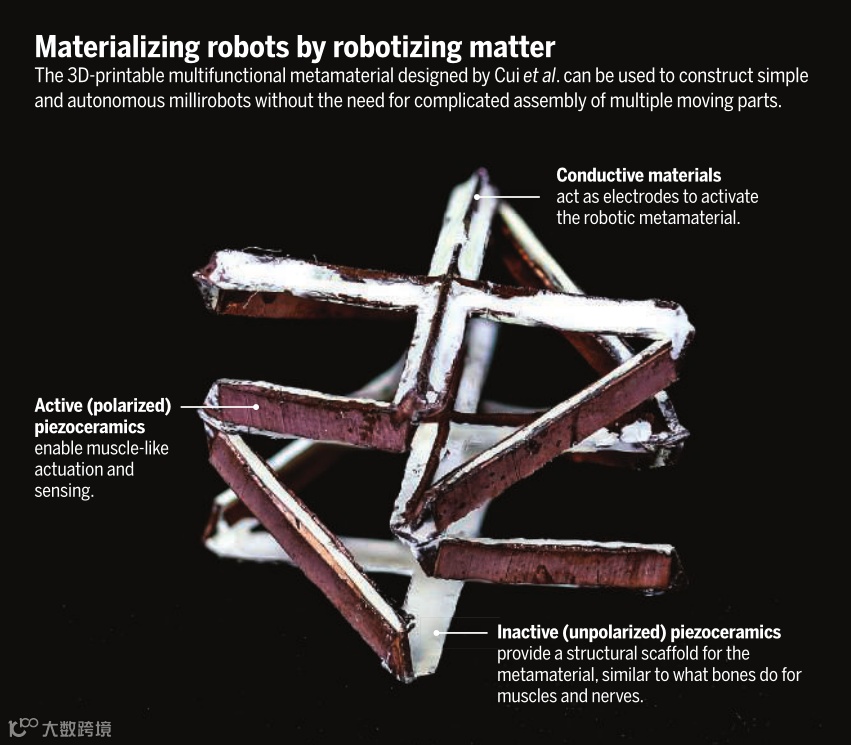 3)由增材制造的机器人超材料可以使用电场到机械应变的双向转换来产生运动和传感。逆压电效应赋予机器人驱动能力,而直接和双向压电效应分别通过本体感受(自我监测)和外感受(接触检测和遥感)实现反馈控制。
