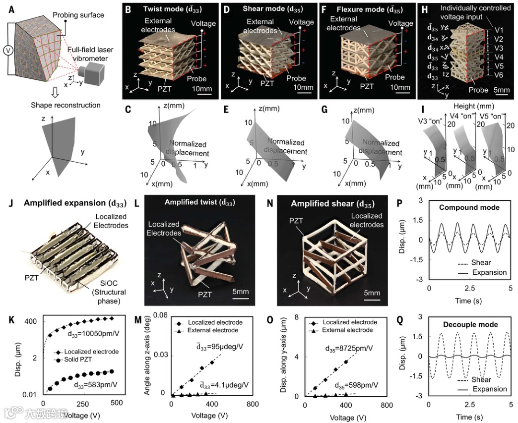 本文报道的多材料增材制造技术将压电陶瓷、金属和结构材料组合成一个复杂的 3D 架构。由此产生的具有毫米到厘米尺寸的超材料块能够输出具有高阻挡力的多自由度运动以及感应接触和远程刺激。这是在没有任何外部传感器和传输的情况下完成的。与其他驱动材料(例如介电弹性体)相比,机器人超材料具有低驱动电压、宽频率范围、双向传感和驱动等优点。