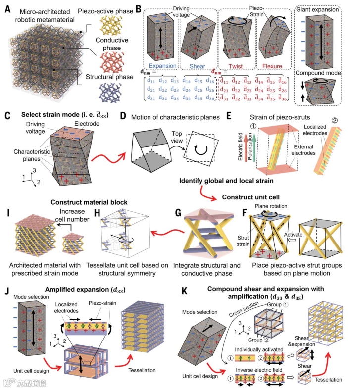 有鉴于此,加州大学洛杉机分校郑小雨教授团队开发了一种合理设计压电超材料的方法,该材料由无源、压电有源和导电相组成,可以执行一些机器人任务。所需的变形模式,例如扭曲,近似为一些通过结构的离散平面的运动。反过来,这些平面的允许运动将告知压电超材料内的结构相、致动器和电极应如何组织,以产生目标运动。在经典的弹性理论中,弹性材料的变形以拉伸、压缩和剪切为特征。本文应用了微极弹性理论,通过在平移之上结合旋转来扩展经典弹性理论。这种方法能够更全面地评估压电超材料的宏观膨胀、剪切、扭曲和弯曲,以及它们的微结构、极化和外加电场。