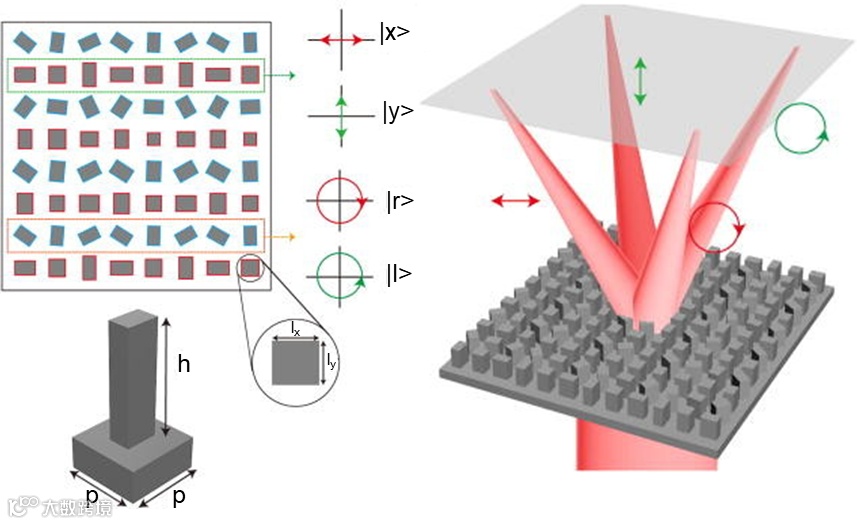 图5 基于超构透镜的偏振成像研究示例。不同偏振的入射光通过超构透镜之后分别聚焦到不同焦点,从而同时获得不同偏振的图像。