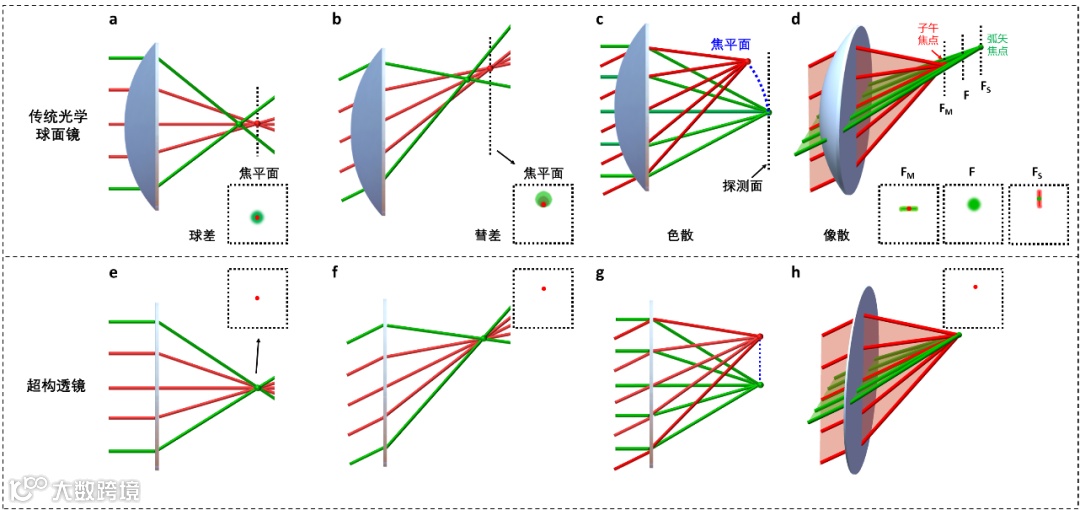 图4 单个传统球面镜的成像存在 (a)球差、(b) 彗差、(c)场曲、(d) 像散等像差,因此需要透镜级联等手段以消除这些像差;单片超构透镜可实现(e)-(h) 所示消像差成像
