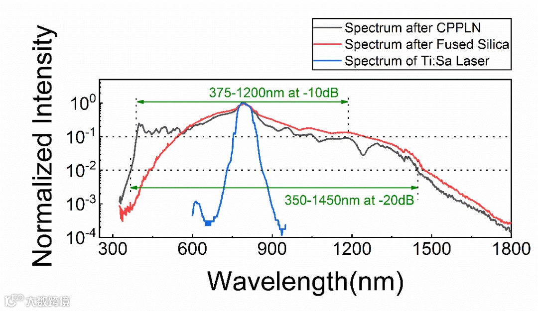 近期,华南理工大学物理与光电学院李志远教授团队,利用0.5 mJ的钛宝石飞秒脉冲激光器泵浦熔融石英产生超连续白光作为泵浦光,以特殊设计的铌酸锂啁啾非线性光子晶体作为工作介质,通过同时使用高达12阶次的准相位匹配,在单块晶体实现了350~850 nm 的超宽带二次谐波产生,平均转换效率约为25.8%。通过石英-CPPLN晶体级联模块产生了10 dB带宽为375~1200 nm(超过1个倍频程),20 dB带宽为350 ~1500 nm(超过2个倍频程)的覆盖紫外-可见光-近红外波段且具备高平坦度的超连续激光光谱,单脉冲能量达到0.17 mJ。研究成果以“Intense Two-Octave Ultraviolet-Visible-Infrared Supercontinuum Laser via High-Efficiency One-Octave Second-Harmonic Generation”为题发表在Research上。