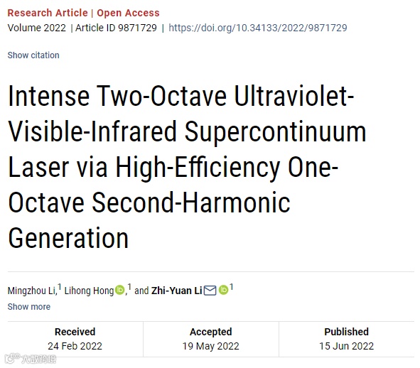 Citation:Mingzhou Li, Lihong Hong, Zhi-Yuan Li, "Intense Two-Octave Ultraviolet-Visible-Infrared Supercontinuum Laser via High-Efficiency One-Octave Second-Harmonic Generation", Research, vol. 2022, Article ID 9871729, 9 pages, 2022. https://doi.org/10.34133/2022/9871729