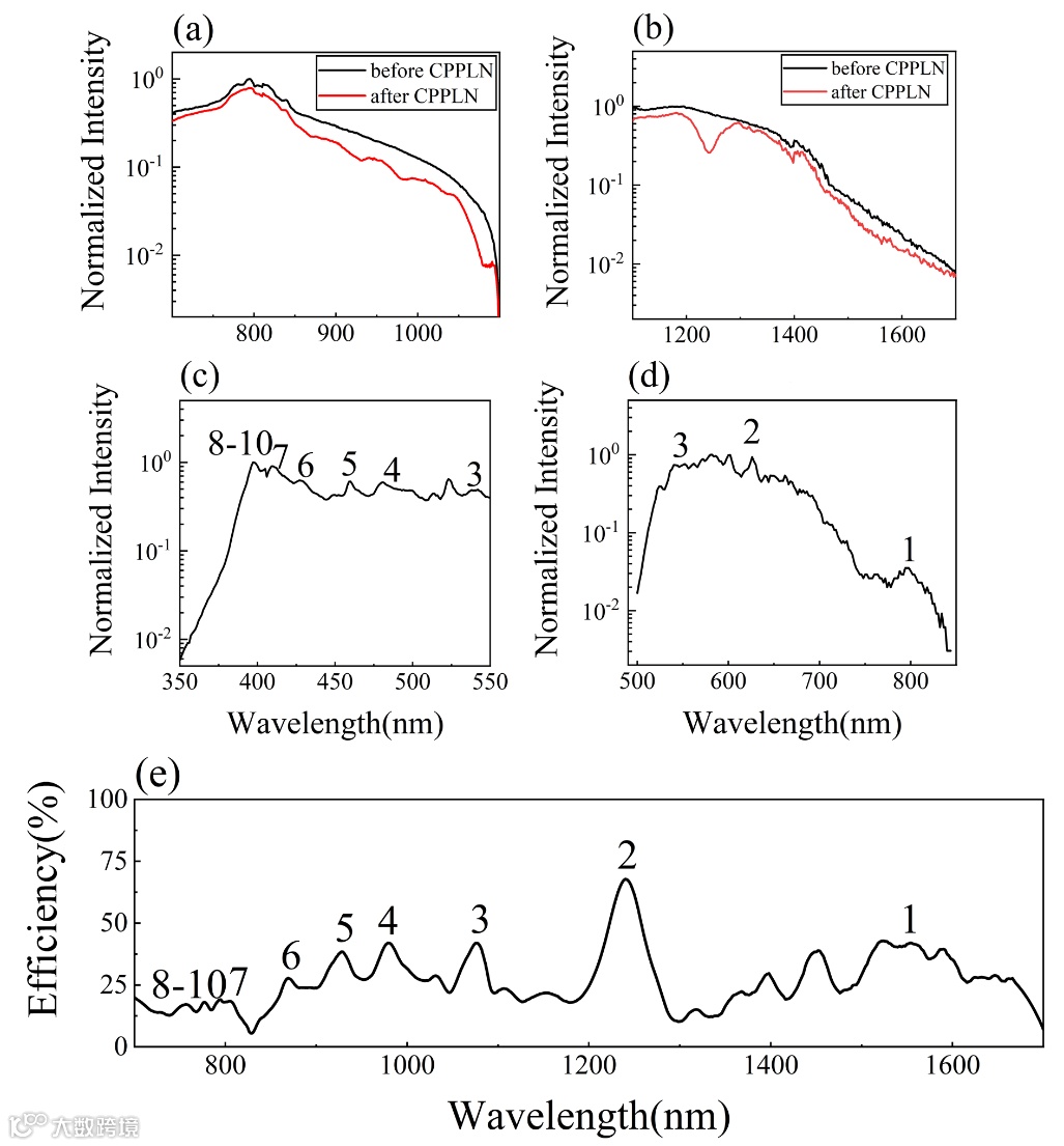 为更好地评估CPPLN晶体的性能,并获得精确的SHG效率,研究团队使用不同的滤光片将超连续泵浦激光分成700~1100 nm和1100~1700 nm两部分进行实验。SHG的测量光谱如图3(c)和(d)所示,分别对应350~550 nm和550~850 nm两个倍频波段。SHG光谱中出现的一系列峰可以归因于不同准相位匹配的倒格矢波段的贡献,这与图1所示的QPM分析很好地吻合。其中,在700~1100 nm的泵浦光范围,1 ~ 3阶次的准相位匹配带有效,在1100~1700 nm的泵浦光,4 ~ 10阶次的准相位匹配带有效。对应于350~850 nm的二次谐波转换范围,CPPLN的倍频转换效率大多为10%~50%,平均转换效率约为25.8%(图3(e))。这些结果均很好地验证了研究团队所设计的CPPLN晶体在超宽带倍频转换方案中所表现出的卓越性能。