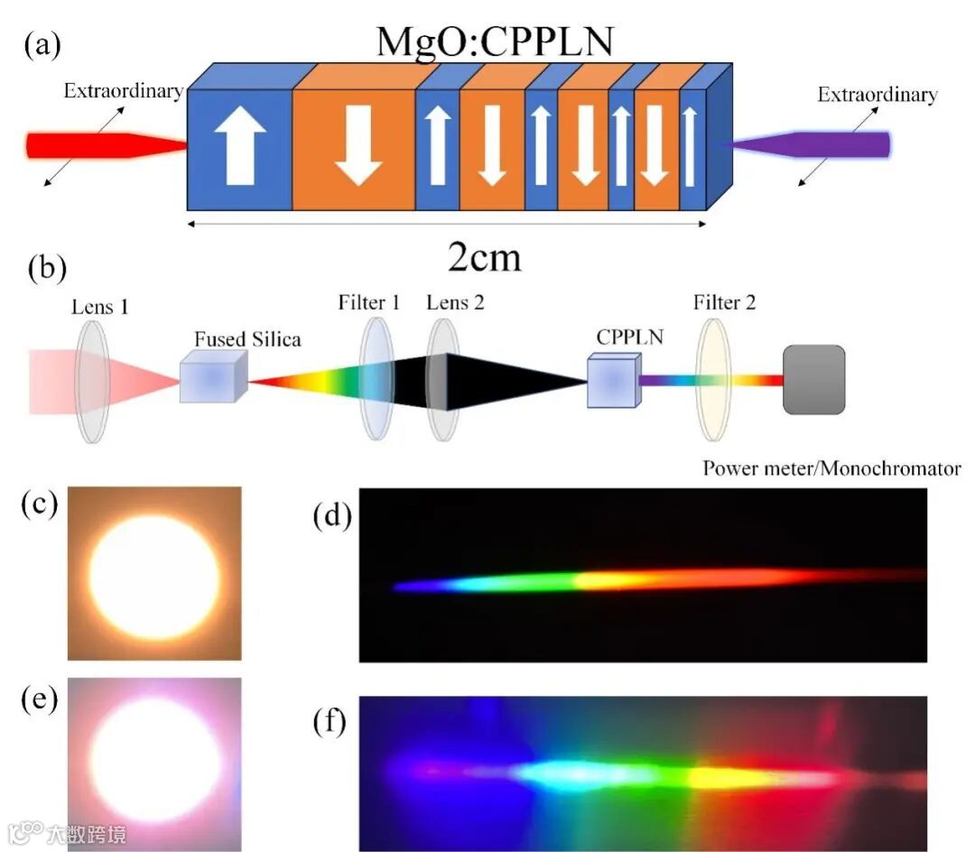 为获得在单块CPPLN晶体中超宽带二次谐波的同时产生,李志远教授团队首先考虑入射光来自钛宝石飞秒激光器泵浦2 cm长的熔融石英产生的超连续白光,以促使入射到CPPLN晶体的基频泵浦激光的带宽足够宽。对比图2(c)和图2(e),可以清楚地看出从熔融石英出射端输出的白光激光光束整体偏暖色调,而从CPPLN晶体出射端输出的白光激光光斑整体偏冷色调,这清楚地表明输出激光的整体色度发生了变化。为了更好地了解输出激光的频率分量,研究团队使用光栅对输出激光束进行定性评价。如图2(d)和图2(f)所示,很明显,CPPLN晶体出射端的一阶衍射光束包含了所有可见光的颜色,并且不同的颜色是平衡的。这初步表明CPPLN产生的二次谐波光谱中含有均匀的可见光成分。