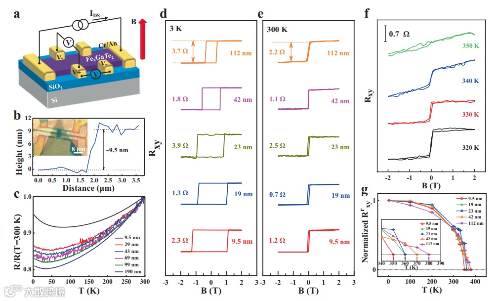 近日,华中科技大学常海欣教授研究团队采用自熔法制备了一种具备显著的PMA的二维vdW铁磁晶体Fe3GaTe2,居里温度达到350 K以上,是已知二维vdW铁磁晶体能达到的最高居里温度,其饱和磁矩高达40.11 emu/g,利用第一性原理计算自旋分辨的态密度在自旋向上和自旋向下之间表现出明显的不对称性,这与观察到的本征铁磁性相一致。此外,还实现了室温下基于Fe3GaTe2的厚度和角度相关的反常霍尔器件和直接磁畴成像技术,该工作对基于二维vdW铁磁晶体和各种vdW异质结构的下一代磁电子学和自旋电子学具有重要意义。(袁铭谦)