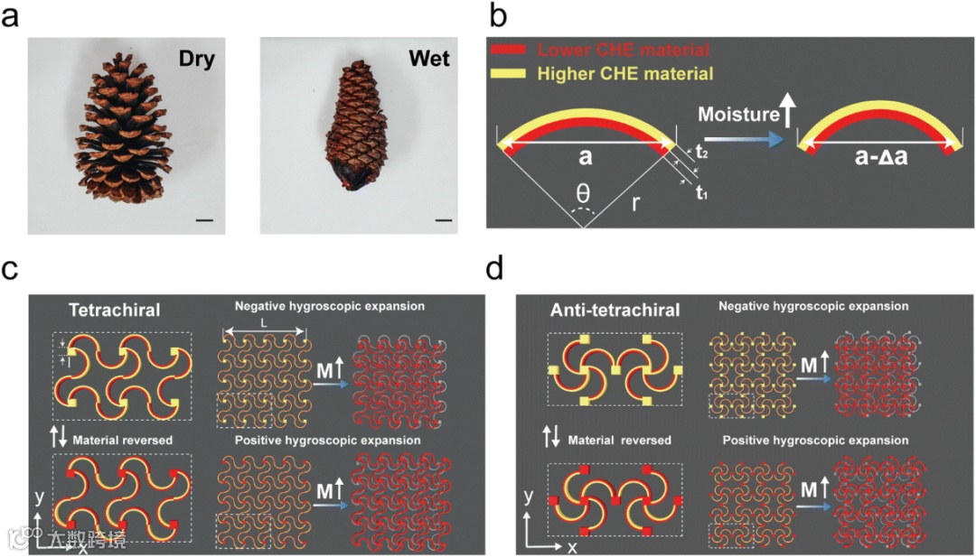 力学超构材料作为超构材料领域的一个重要分支,由于人工设计的微观结构,在各种物理领域下获得了不同于传统材料的违反直觉的力学性能。它们在航空航天、保护设施和传感器等应用中显示出巨大的潜力。负热膨胀超构材料能够通过结合具有正热膨胀的材料来消除热应力,在光学设备、卫星天线和电子设备等器件或结构中需求量很大。与热膨胀对结构的影响类似,一些材料具有吸湿性,从空气中吸收水分,由于受约束系统中组成材料的吸湿膨胀不匹配而产生应力。它与热应力相当,可能导致劣化甚至失效。同时,无机材料总是对水分不敏感。当组件在吸收水分时的变形不同时,就会产生吸湿应力。此外,木材结构在湿度变化的环境和受限系统中也会产生吸湿应力。纤维增强层压板中吸湿引起的膨胀可能导致分层和开裂。吸湿应力会造成多种危害,同时它可以通过负吸湿膨胀(NHE)材料来平衡。传统材料很难通过改变成分和加工方法来实现NHE效果,但超构材料的出现提供了解决方案。但是,到目前为止,只有少数工作通过理论分析而不是模拟和实验来研究具有简单NHE特征的超构材料(如销连接的2D桁架结构和环杆结构)。考虑到实际环境吸湿条件远比理论计算复杂,需要平衡的吸湿变形也非常复杂,因此研究需要综合分析远远超出各向同性NHE模式的各种异常吸湿变形模式,并有必要进行实验。此外,复杂的环境条件和应用要求不仅需要任意变形,还需要自定义变形甚至可以重复编程,这远远超出了以前制造后具有固定功能的力学超构材料。