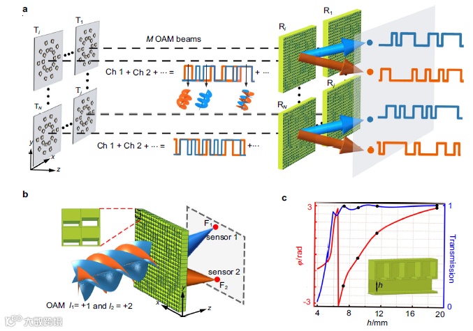 如何不断提高波所携带信息的传输能力和传输速度,是波动物理学的一个基本问题,也是众多应用领域的迫切需要。一个典型的例子是以声波为代表的水下通信,其吸收和散射效应比电磁通信低,然而,由于声波固有的低频率、低速度和无极化特性,突破目前的信息传输效率一直是水声通信面临的重要挑战。近年来,基于轨道角动量(OAM)的水声通信被提出并实现,它将空间作为一种不依赖于相位和振幅的新维度来编码信息。对于具有特定OAM的涡旋声束,基于其传输的正交性,携带独立信息的不同模态传输波束可以在无模态串扰的情况下复用到同一路径。这使得声通信能力显著提高,但需要对使用复杂传感器阵列或多层超材料接收到的信号进行后处理,这些材料的解复用能力受到插入损耗和衍射效应的限制。更重要的是,OAM复用策略依赖于多个同轴重叠的扭曲波束作为正交通信信道,而非同轴波束进一步提高声通信效率的潜力尚未开发。在这种情况下,通道数量必须增加,包括更多的高阶OAM模式,这导致更严重的衍射和空间混叠效应,限制了可用通信通道的最大数量。
