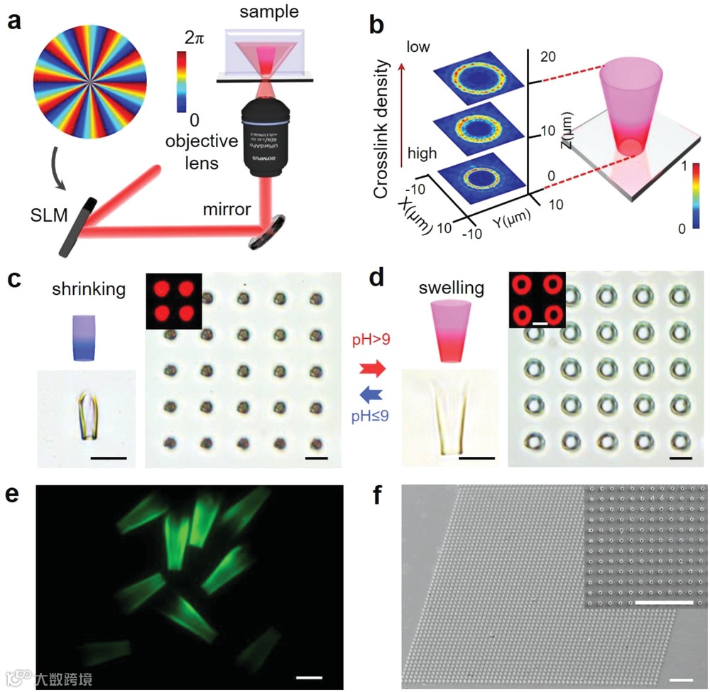 无系留微型机器能够在生物空间中导航,有望应用于微创手术、成像引导分娩、传感和靶向治疗等。尽管在微型机器的制造、驱动和功能化方面取得了巨大进展,但实现微型机器在活体中的应用仍然具有挑战性。由于生物体内存在大量复杂的网络(如血管、神经系统、消化系统),具有形状变形的微型机器能力具有适应这些复杂微网络以用于特定应用的巨大潜力。基于小尺寸和可控的形状转换,变形微机械(SMM)有望无创地进入生物体内的受限和敏感区域,从而彻底改变各种生物医学领域。最近,已经开发出多种智能SMM,可以在各种形式的刺激下变形为多种构象,包括化学分子、磁场和光。独特的可变形性促进了SMM在动态可调微光学、靶向递送和货物显微操作中的广泛应用。尽管已经将各种微机械与刺激响应特性相结合以获得令人印象深刻的环境适应性,但它们中的大多数都需要多步骤的2D制造工艺来实现异质刺激响应材料的图案化。作为一种高精度和真正的3D加工方法,直接激光写入(DLW)及其全息延伸曝光已成为编程各种材料和实现各种微结构的有效途径。4D打印的微型鱼和微型抓手已被提议用于精确的药物释放和微粒捕获。然而,当前基于DLW的4D打印仍然存在问题。例如,广泛采用的点对点扫描策略通常效率低下,单一刺激响应材料限制微机械合成功能,在狭窄而复杂的微网络中的可控导航仍未得到探索。