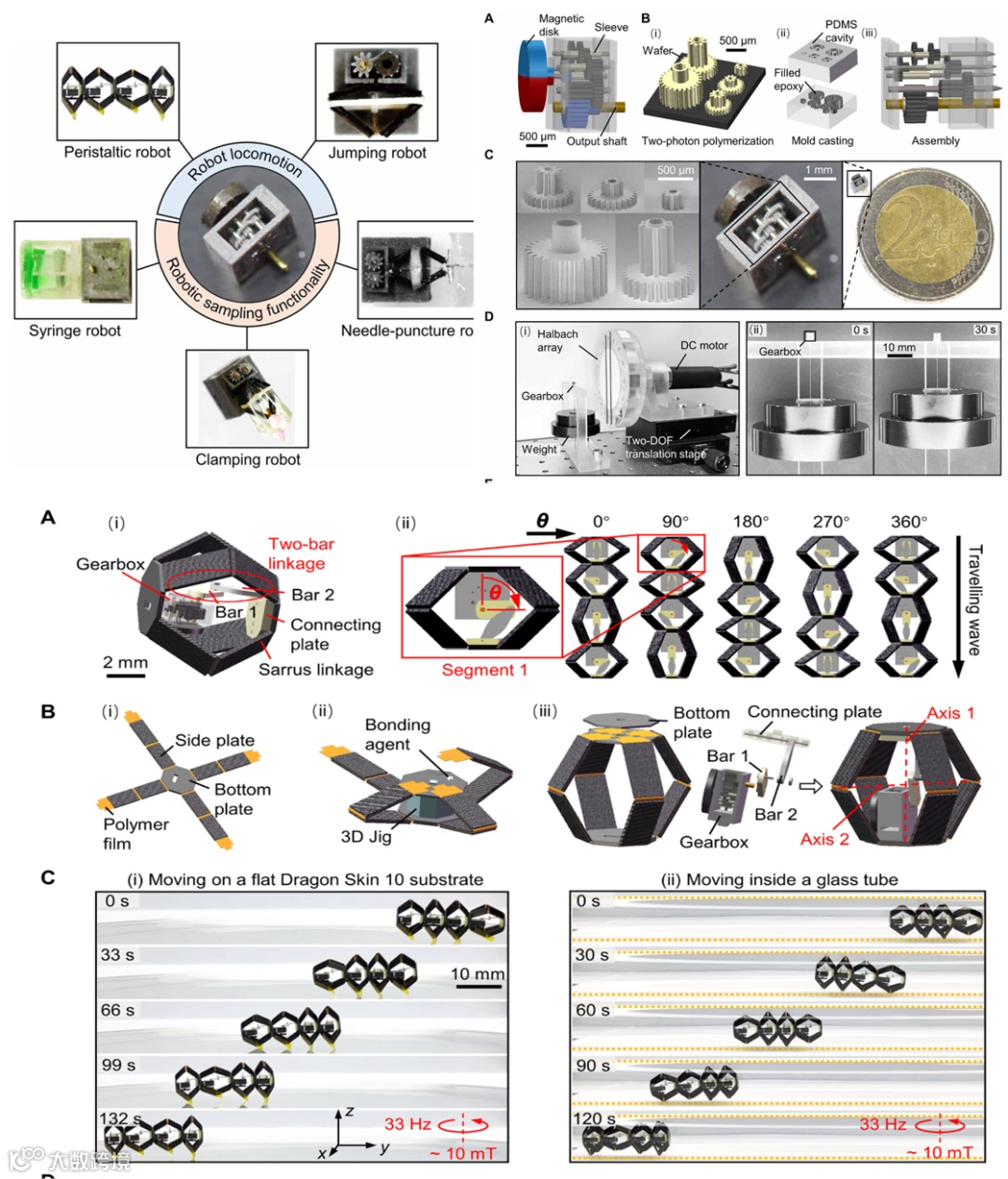 磁驱可为受限工作空间中的磁性微机器人提供快速、精确、无线和灵巧的力和力矩。在毫米级的许多应用中,需要高达数百毫牛顿的驱动力来穿透生物组织、撑开塌陷的空间或施加垂直于衬底的粘附力。然而,随着机器人尺寸的减小,磁力和力矩随着尺寸的减小而迅速减小,需要将磁铁放置在离机器人非常近的位置以获得相当高的磁场强度,从而限制了其在机器人远离磁场来源的情况下的应用,例如控制人体内部深处的微型机器人。此外,通过机械传动系统放大磁力矩和力输出也是一种很有前途的选择。轮系作为最广泛使用的放大施加的扭矩或力的传动系统之一,已在许多微系统和各种芯片应用。这些设计类似于许多缆绳驱动的机器人的传动,其中减速器与电机分开,并位于手臂的连接处。磁力矩或磁力被放大,传动刚度增加。所有这些优点促使研究人员为磁力驱动的移动毫米级机器人开发了微型变速箱,以实现更好的运动能力和不同的机器人功能。虽然微型变速箱已经用于由电机驱动的机器人,但机器人上集成的车载电源的困难阻碍了这些机器人的无线控制,制约了磁性毫米级机器人的运动性能和功能。