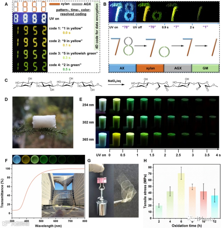 聚木糖独特的余辉颜色变化特征赋予了材料优异的信息加密、存储及防伪功能。可进一步通过氧化反应将聚木糖转化为水溶性双醛聚木糖,赋予其加工成型特性,同时羰基的引入可有效促进三线态激子的产生,其寿命延长至近700毫秒,磷光量子产率高达5.8%。由于水溶性双醛聚木糖良好的可加工特性,可进一步将其制备成性能优异的塑形磷光泡沫以及大尺寸、高机械强度的透明磷光薄膜材料。“本研究为半纤维素开拓了新的应用领域,即颜色可调室温磷光体系,并为半纤维素室温磷光材料的设计提供理论依据和技术支撑,推进了有机室温磷光领域的绿色发展,有望在未来满足社会对低成本、无污染、高性能磷光信息功能材料的需求。”彭锋教授如是总结说。