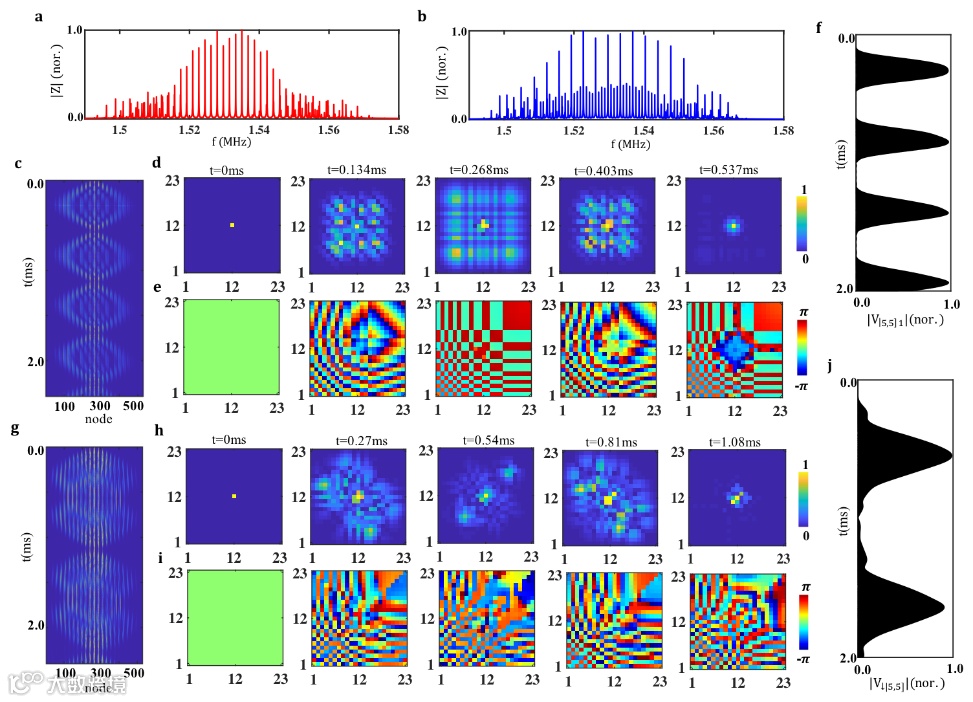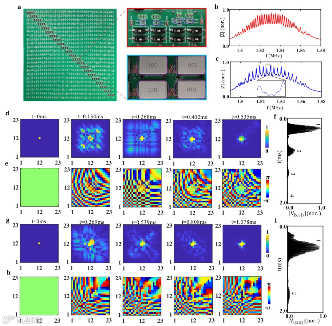 图2和图3中的理论仿真和实验测量进一步验证了电路网络的有效性。图3a显示的是电路网络的样品图。首先,频域的阻抗测量可以清楚的展现电路网络的等间距能谱,并且频率间隔满足玻色子-电路网络为赝费米-电路网络的两倍(图2a,2b和图3b,3c)。时域仿真和测量的结果进一步展现了由统计决定的布洛赫振荡现象,并且与双体-任意子的一维晶格模型一致。图2c和2g显示了仿真结果中所有电路格点的电压信号随时间的演化行为。可以清晰的看出,在经典电路网络中电压信号也发生了周期性振荡的现象。赝费米-电路网络的振荡周期是玻色子-电路网络的两倍。为了更直观的展现电压信号的振荡行为,图2b(2e)与2h(2i)分别展现了激发点电压的振幅(相位)在不同时刻的空间分布。可以看到,玻色子-电路网络中电压相位的对称分布与赝费米-电路网络中电压相位的反对称分布与量子统计所决定的波函数特性一致。相应的实验结果展现在图3d(3e)和3g(3h)中,其与仿真结果相吻合。最后,数值计算的单格点电压信号在玻色子-电路网络(赝费米-电路网络)的振荡行为显示在图2f(2j)。相应的实验结果显示在图3f(3i)中。进一步可以看出,赝费米-电路网络的振荡周期是玻色子-电路网络的两倍。实验中振荡电压信号的显著衰减的是由电路中的损耗引起的。最后,研究者还在理论上指出,通过平衡外加势场和统计角的竞争关系,具有介于0到